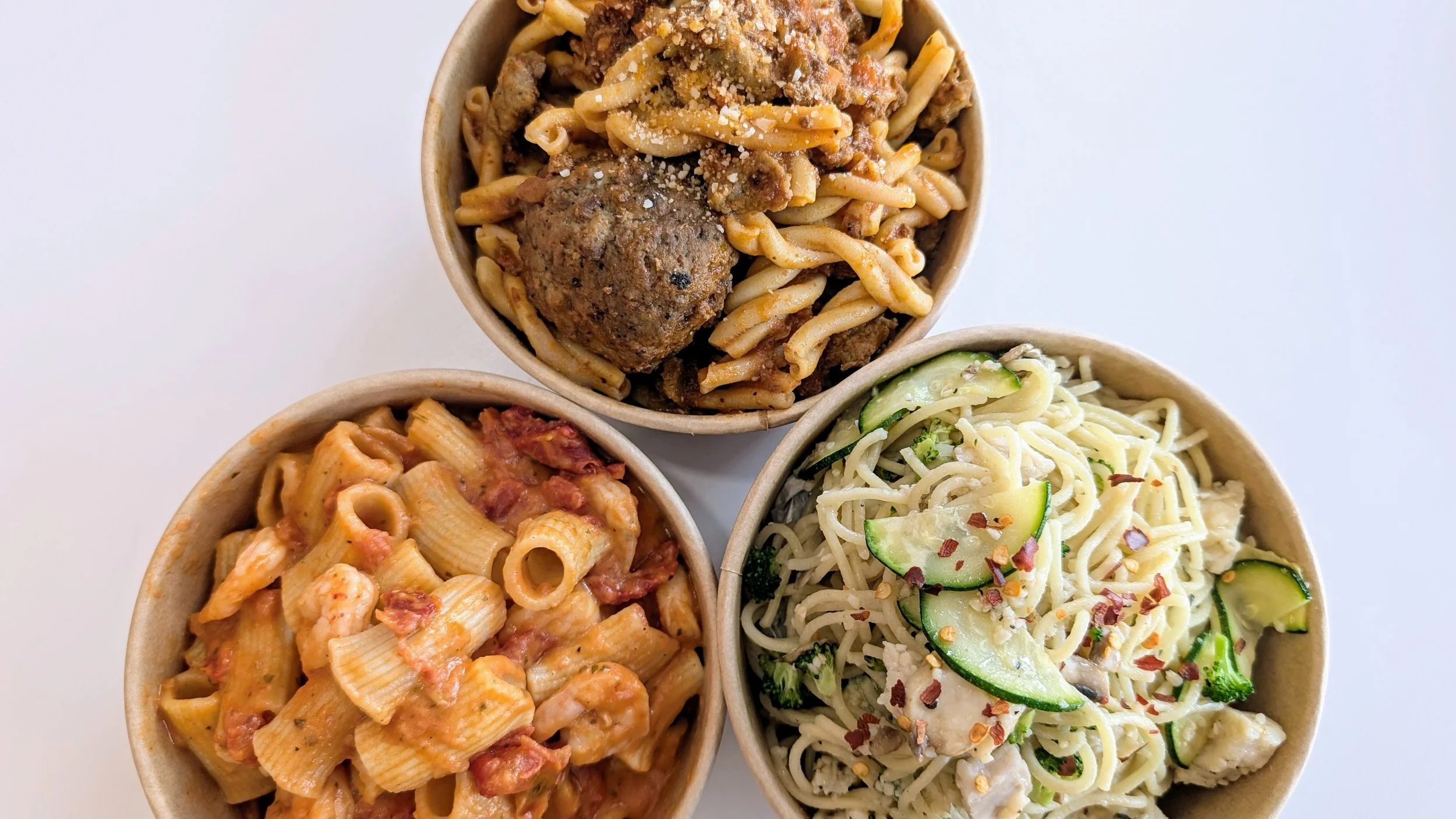 We make our pasta fresh daily with only two ingredients, offering a high-protein, better-for-you option that cooks to perfection in minutes. Our menu features a few pre-chosen combos, but every bowl is customizable with your favorite sauces, proteins, and fresh veggies, making it a personalized meal that’s both quick and satisfying.
