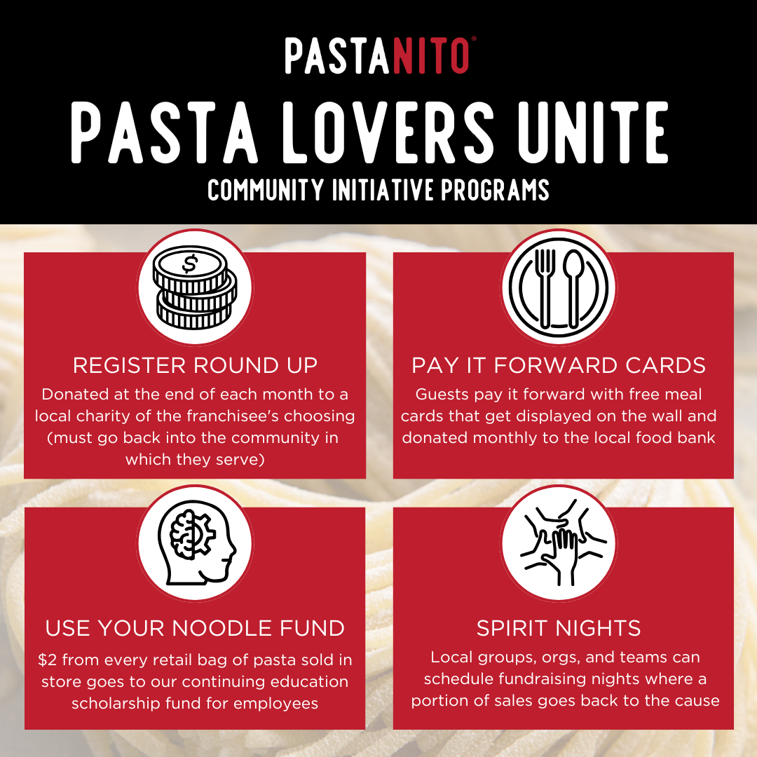 Each PastaNito location gives right back to the community in which we serve in a variety of ways. At the register, guests can round up to the nearest dollar to give to a local organization of the franchisee’s choosing (must be local). Funds are donated at the end of each month and the organizations rotate.