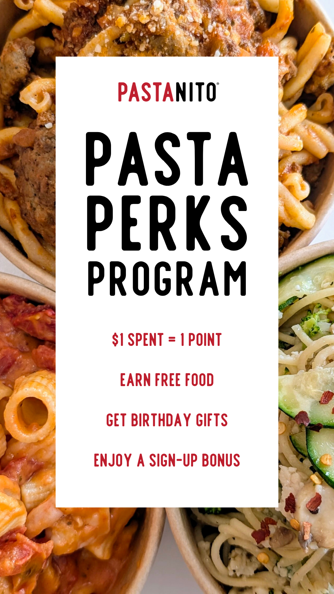 Pasta lovers unite: Join PastaNito’s Pasta Perks Program and for every dollar spent, you’ll earn a point towards free menu items. Earn 25 points just for signing up.