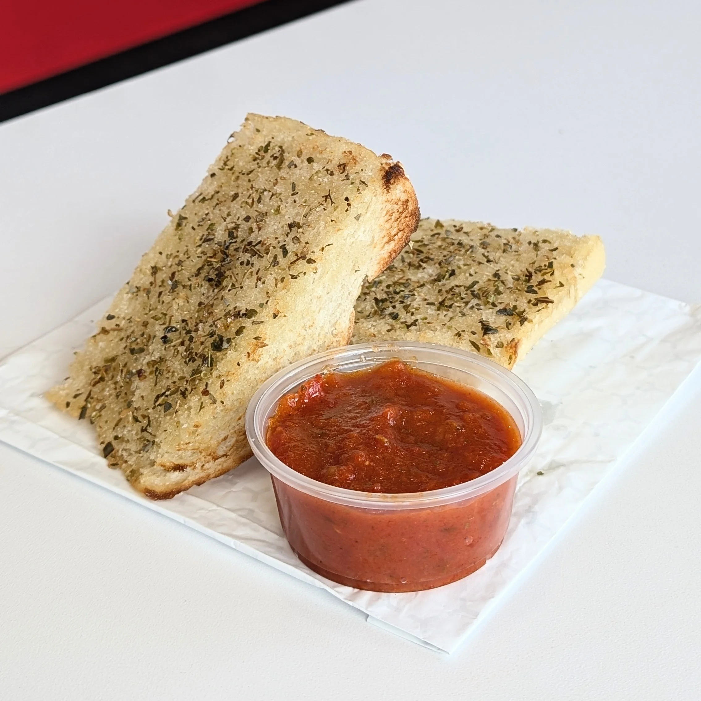 Toasted Italian bread with garlic butter and oregano with marinara for dipping!